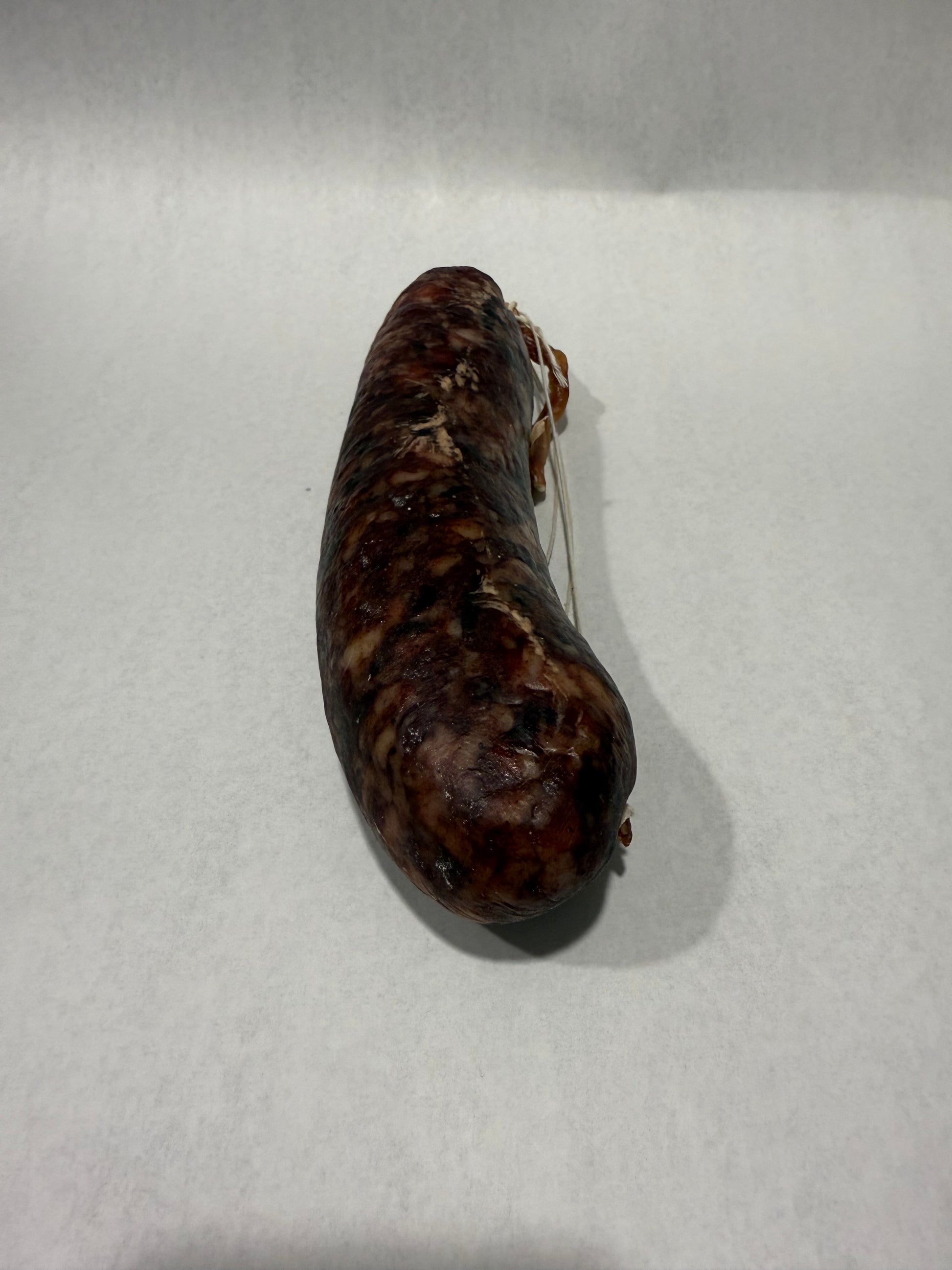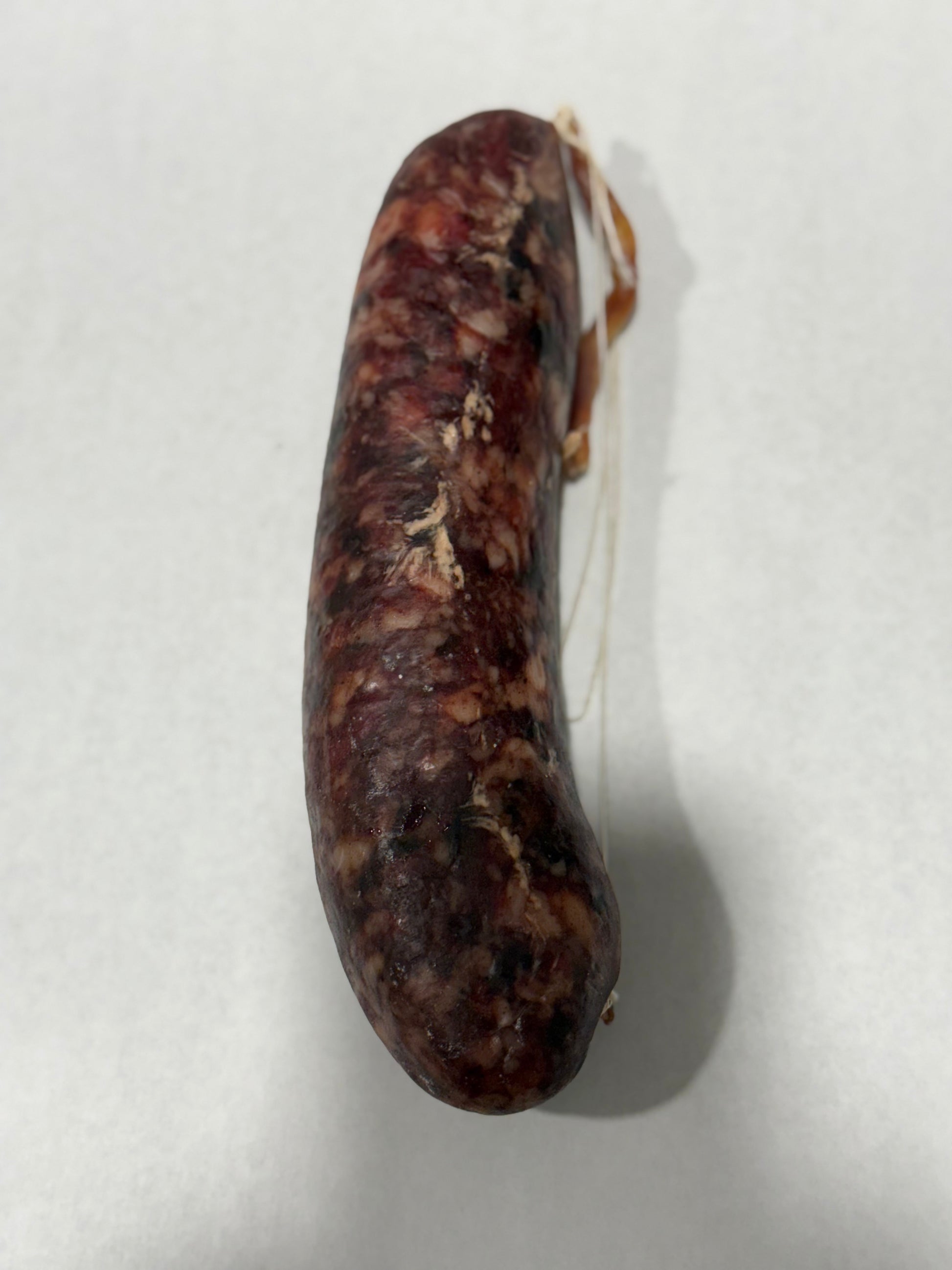 Carne e fegato di suino sono macinati, salati. In seguito, l’impasto viene insaccato in budello naturale e legato.